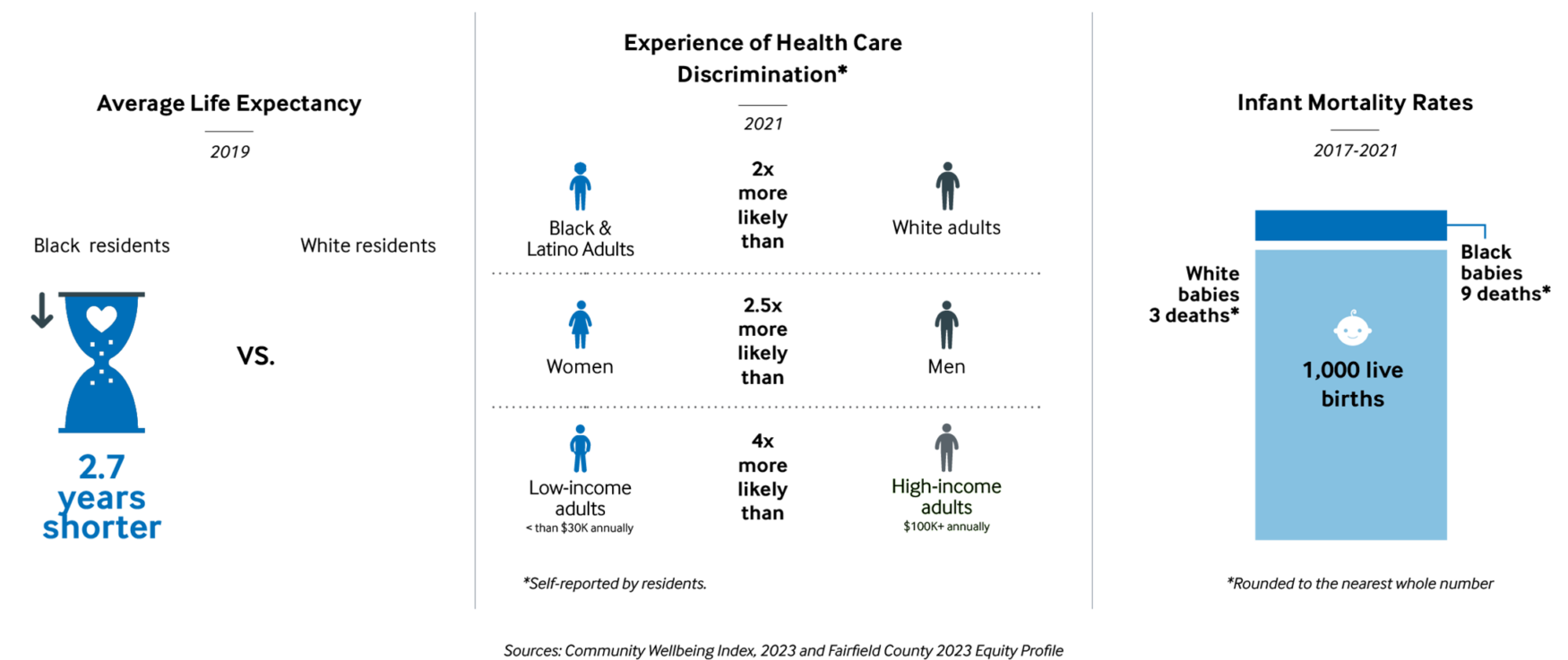 Health outcomes are not the same for everyone in Fairfield County. On average, Black residents have shorter life expectancy than white residents, and Black babies are more likely to die at birth. Factors such as race, income, and gender can also influence how people are treated as patients and the quality of care they receive within the medical system.
